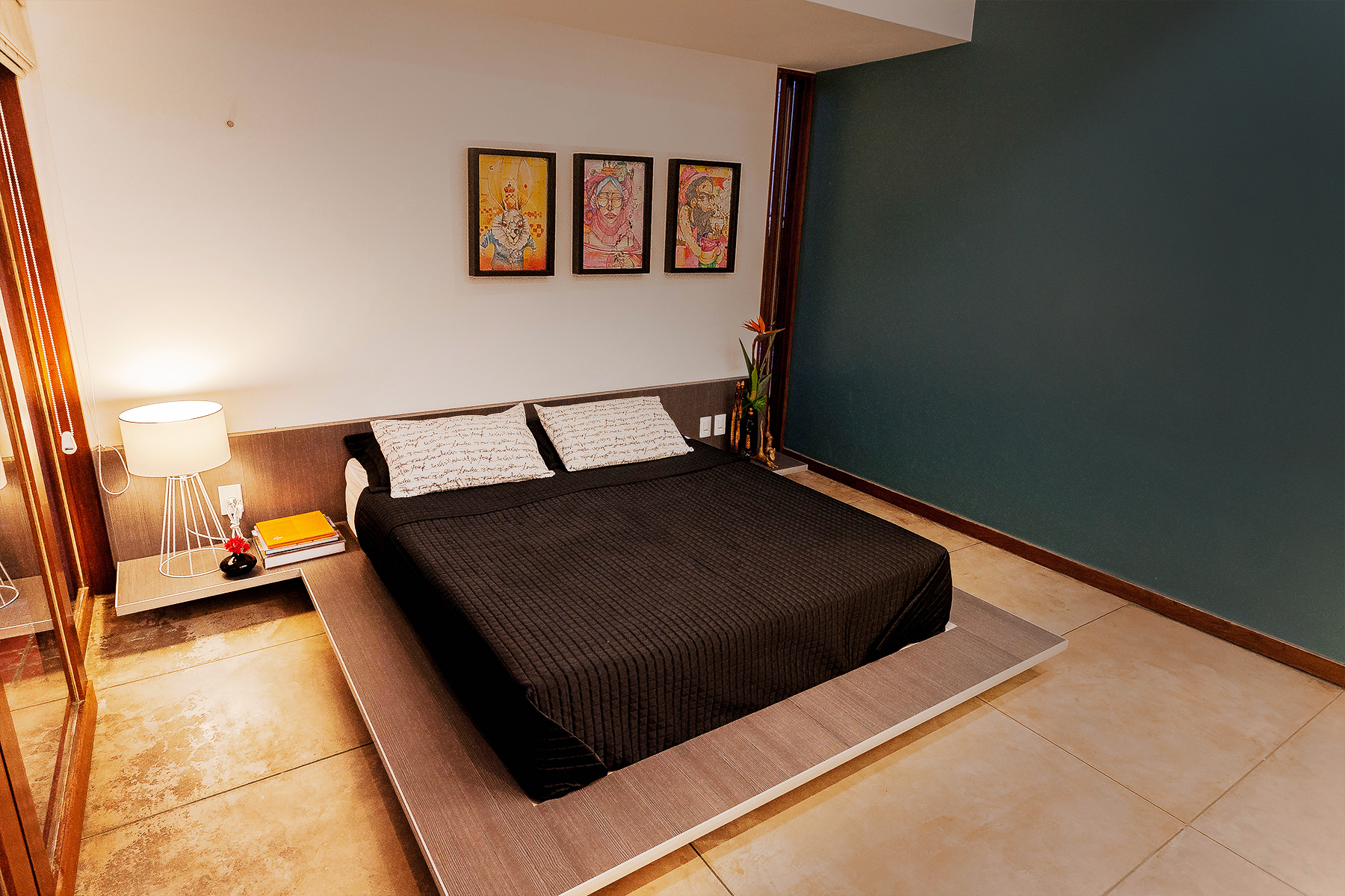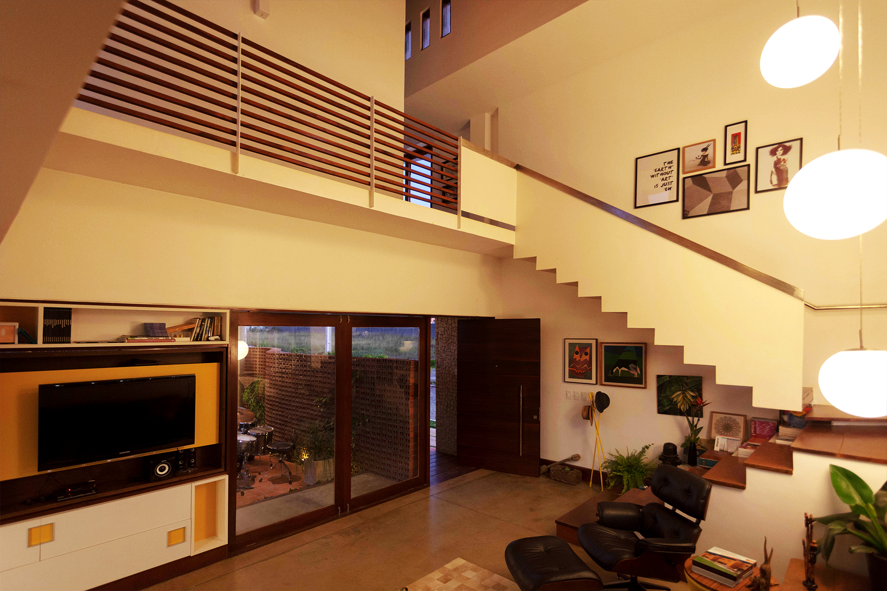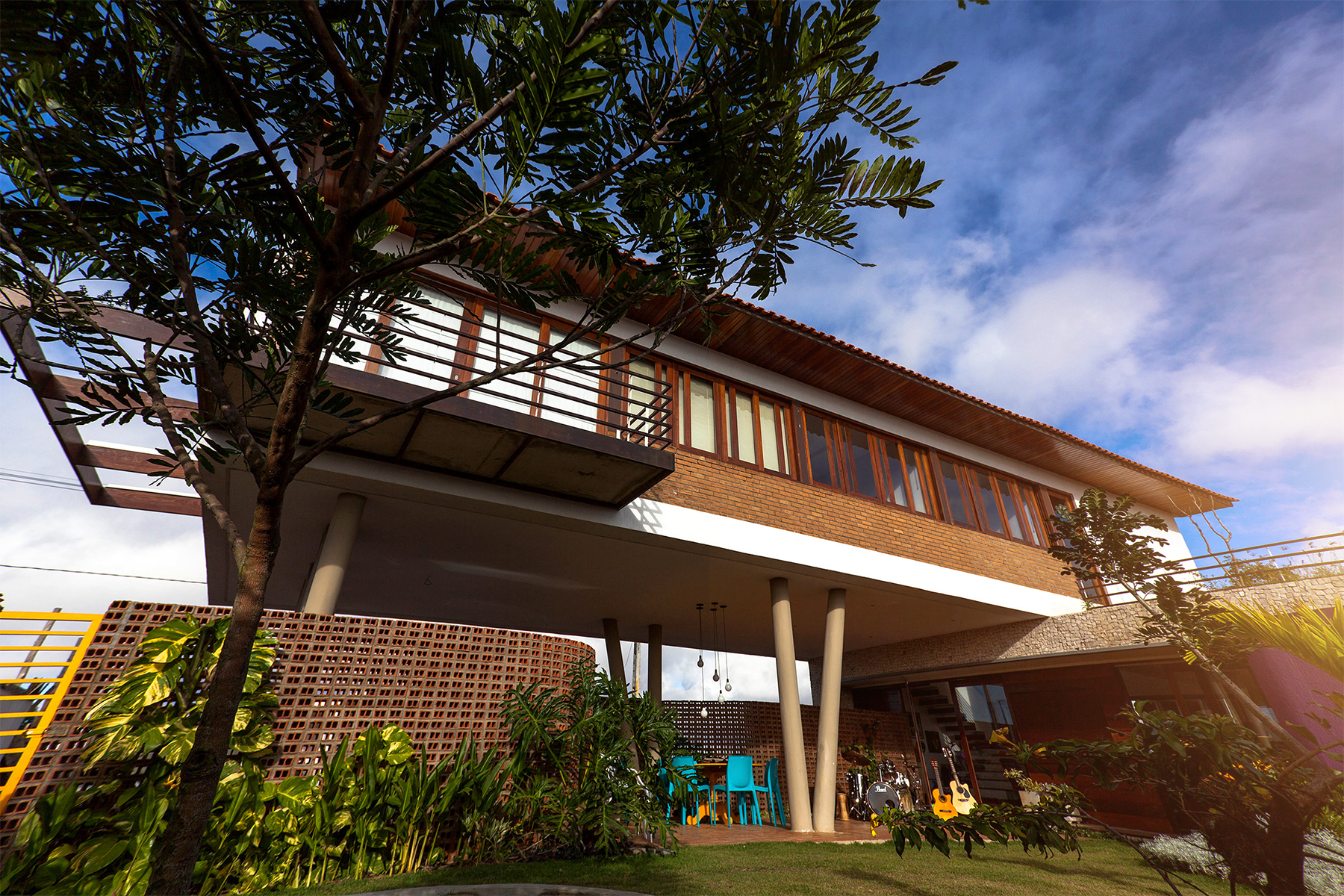 No pavimento superior, circulação e banheiros cumprem a função de proteger os quartos da insolação. Dessa forma, somando-se o isolamento térmico aos grandes vãos de esquadrias, a casa se mantem sempre fresca e arejada. Reservatório superior e local para condensadores Split estão abrigados no interior do volume amarelo que aparece na parte superior da fachada oeste. Essa casa tem um projeto desprovido de vaidade, onde a única intenção seria criar espaços para a convivência, para receber os amigos e a música, sempre presente nesses encontros. Espaços para as crianças espalharem seus brinquedos e passar as horas de ócio necessário.Espaços para as brincadeiras e os banhos de mangueira nos dias de sol. Cantos para ler um bom livro, ou apenas para parar e contemplar os jardins. A casa é estranha ao que está no inconsciente das pessoas quando se pensa no estereótipo da residência. Aquela casa é como uma roupa de alfaiataria, que só cabe para quem foi projetada.