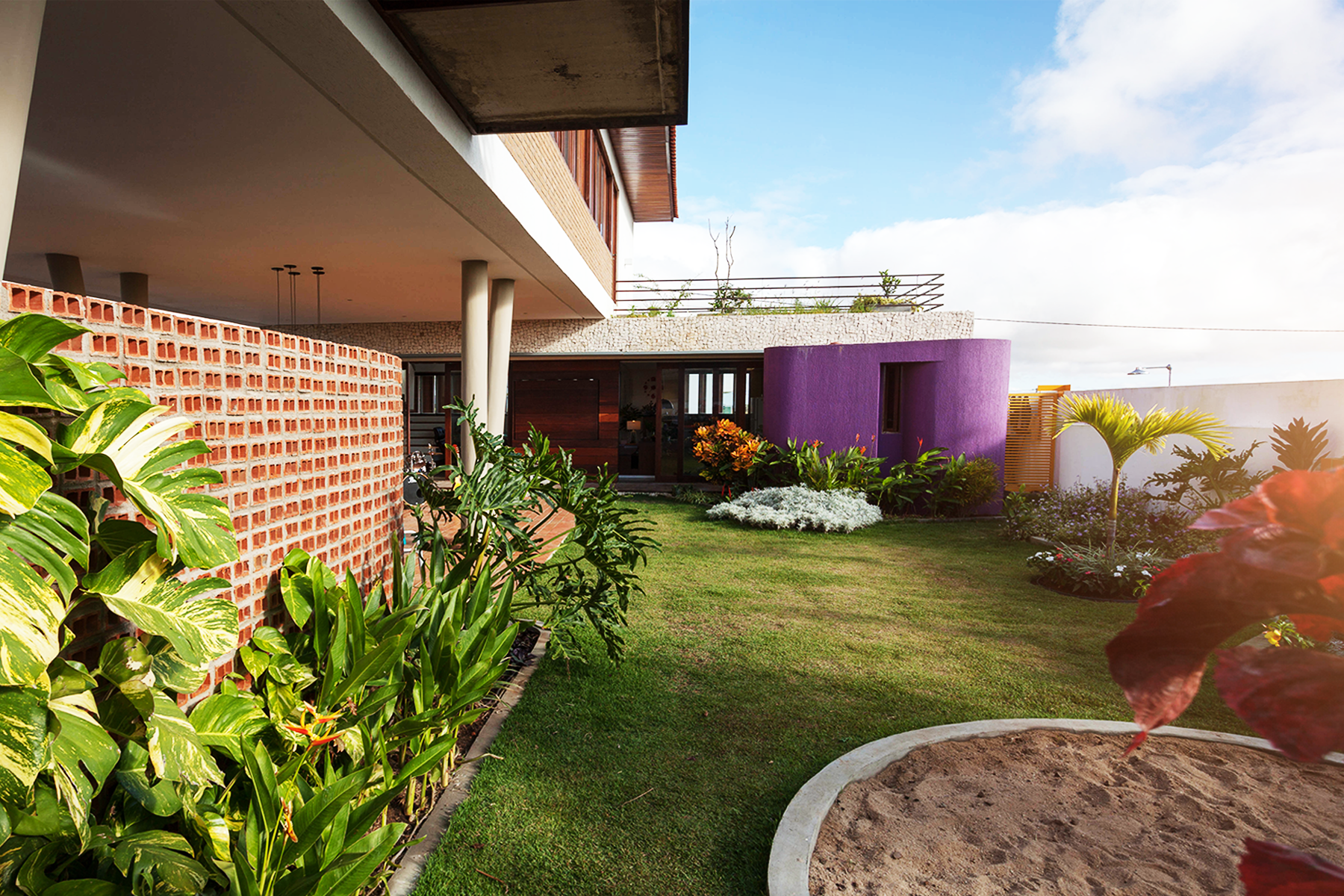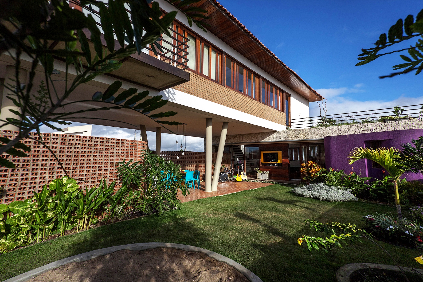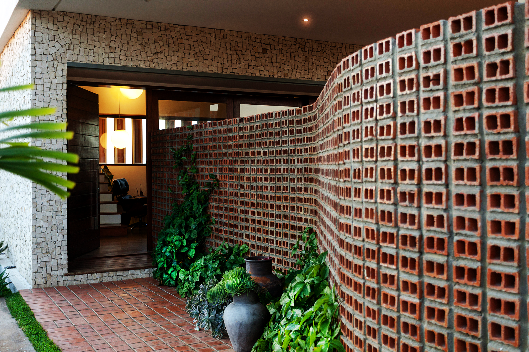 A ideia seria ocupar a menor área possível de terreno com construção no nível térreo. Para tanto dos 375,00m² do lote, apenas 75,00 m², foram utilizados para a distribuição de estar, cozinha, lavabo e área de serviço. A área restante, toda, está aberta e distribuída entre jardins internos, externos e terraços. Uma parede sinuosa, construída em tijolo de dois furos aparentes, assentados com os furos expostos, como uma espécie de cobogó, faz às vezes de elemento divisor do ambiente público e do ambiente privado. Ela ao mesmo tempo em que permite a fluidez da ventilação, já que é vazada, também resguarda a intimidade da área de lazer aberta para o pátio interno, carinhosamente chamada de “bebódromo”, nomenclatura muito usada nos projetos do escritório de Wandenkolk Tinoco. Além disso, é ela que marca e conduz o visitante a ponta de acesso social.
