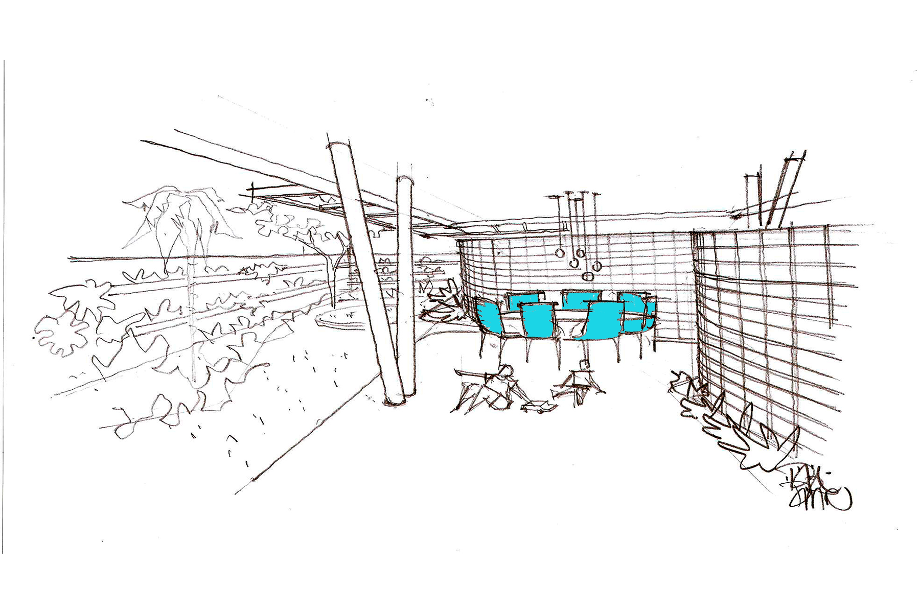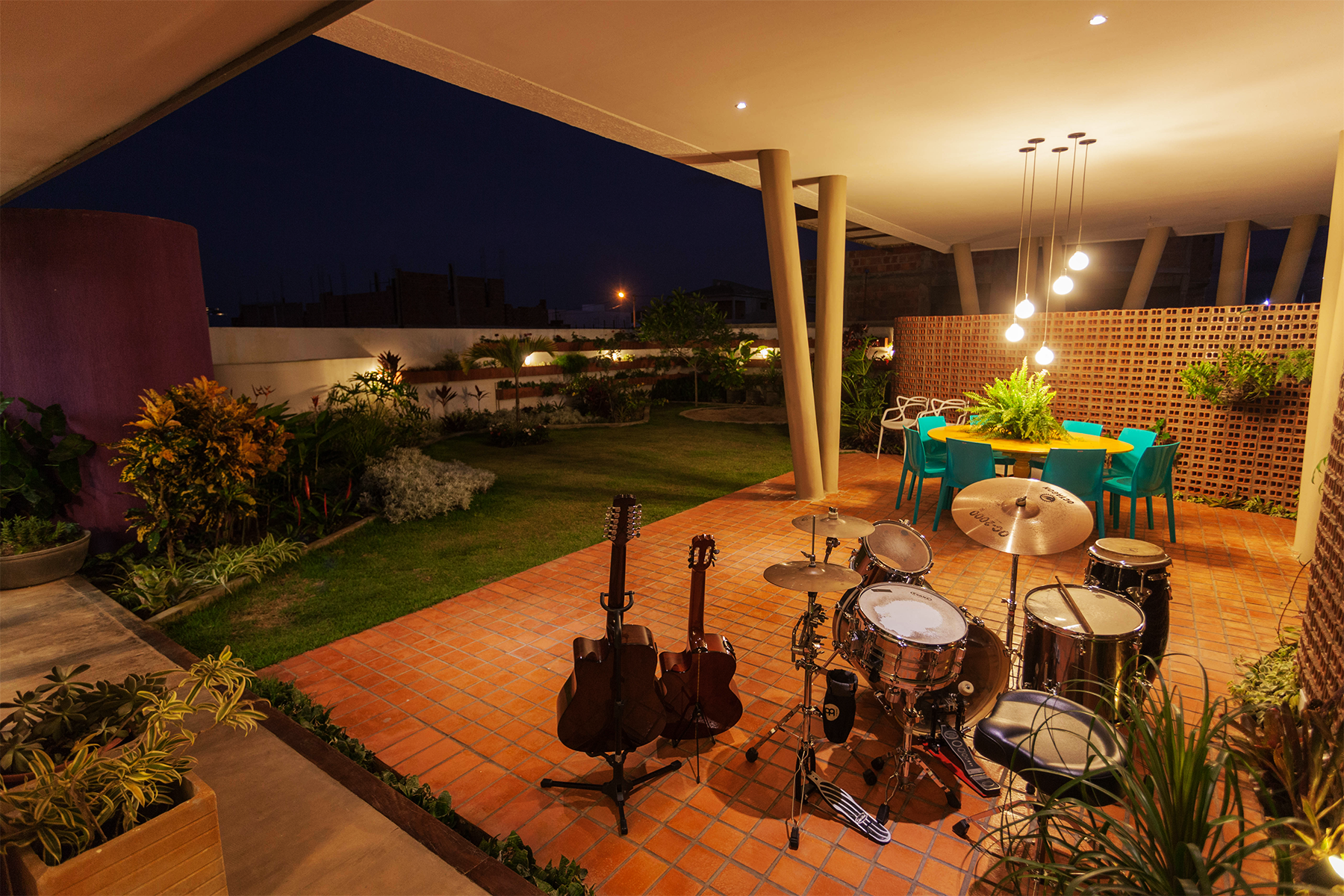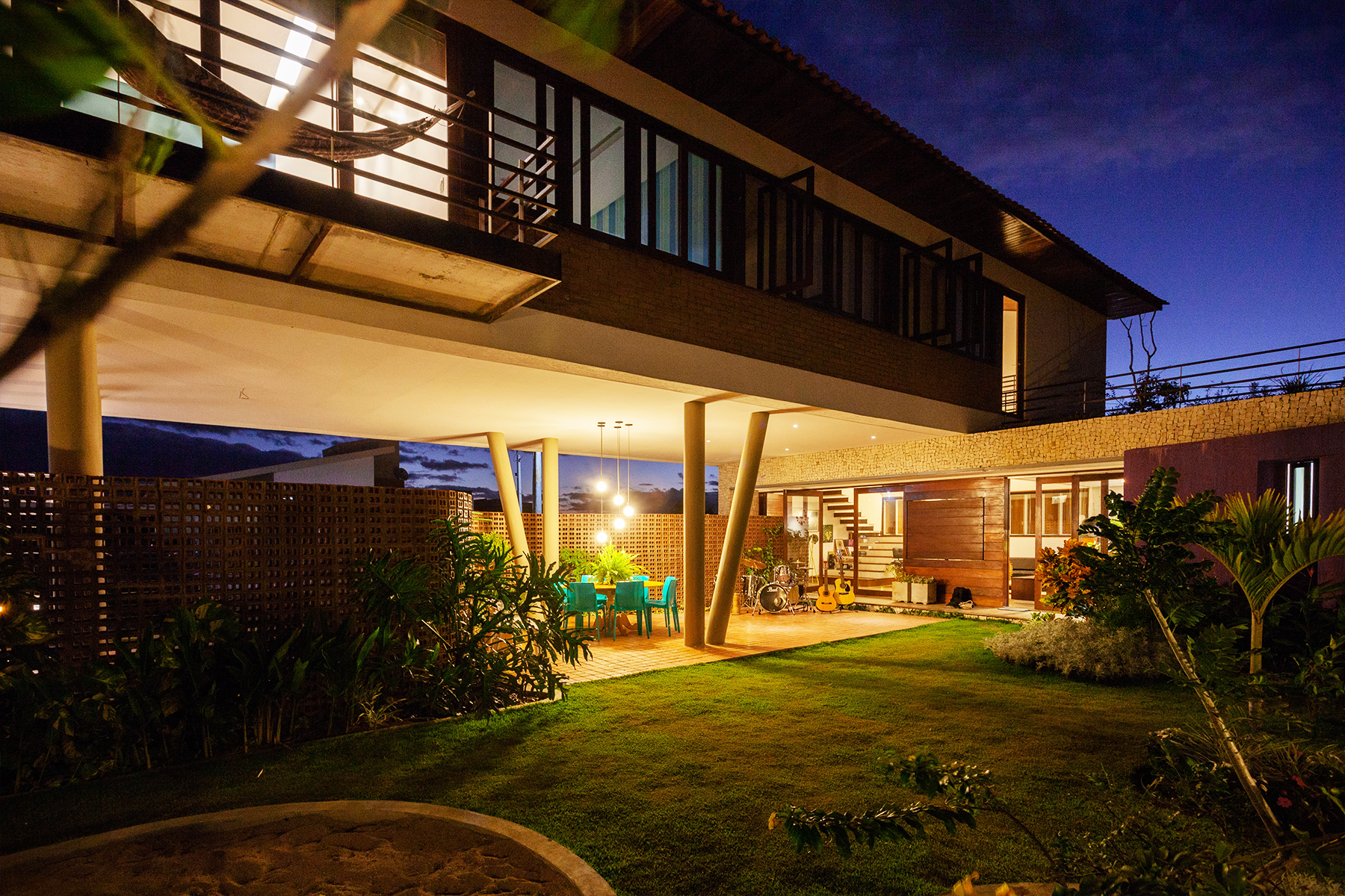A ideia seria ocupar a menor área possível de terreno com construção no nível térreo. Para tanto dos 375,00m² do lote, apenas 75,00 m², foram utilizados para a distribuição de estar, cozinha, lavabo e área de serviço. A área restante, toda, está aberta e distribuída entre jardins internos, externos e terraços. Uma parede sinuosa, construída em tijolo de dois furos aparentes, assentados com os furos expostos, como uma espécie de cobogó, faz às vezes de elemento divisor do ambiente público e do ambiente privado. Ela ao mesmo tempo em que permite a fluidez da ventilação, já que é vazada, também resguarda a intimidade da área de lazer aberta para o pátio interno, carinhosamente chamada de “bebódromo”, nomenclatura muito usada nos projetos do escritório de Wandenkolk Tinoco. Além disso, é ela que marca e conduz o visitante a ponta de acesso social.