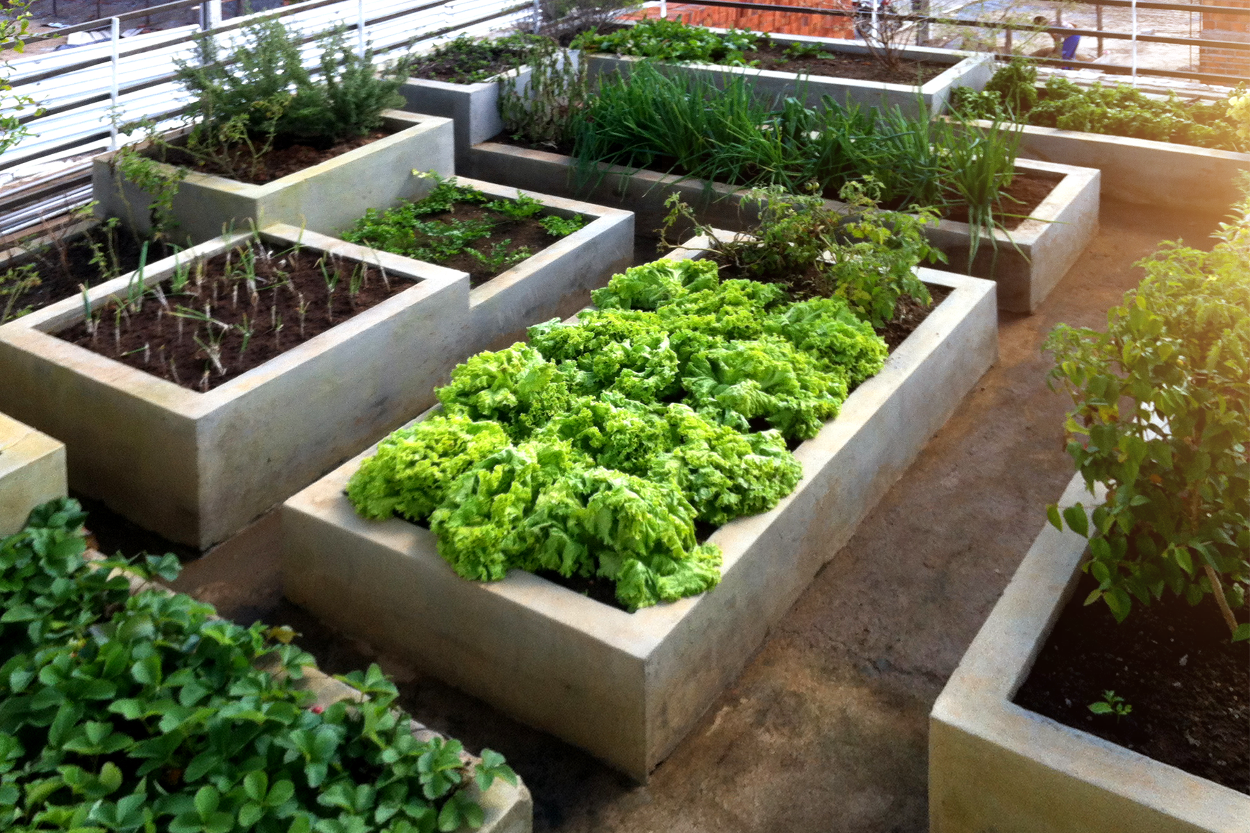 No pátio, os jardins são montados da maneira mais espontânea e orgânica que se possa imaginar. Não há uma definição projetual, mas sim uma coleção de plantas que se complementa a cada visita que faço às sementeiras. O arquiteto é o jardineiro, e o jardim é a sua principal atividade de relaxamento. No pavimento superior, sobre a laje da cozinha, foi implantada uma horta, onde são cultivadas verduras hortaliças e algumas ervam medicinais.