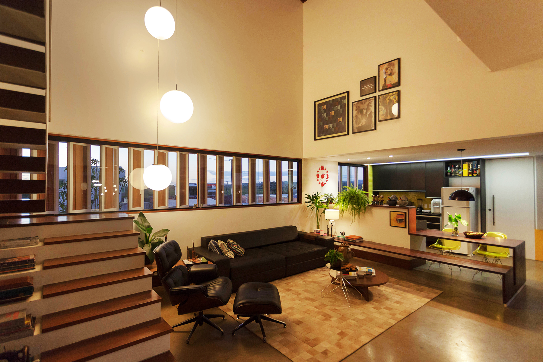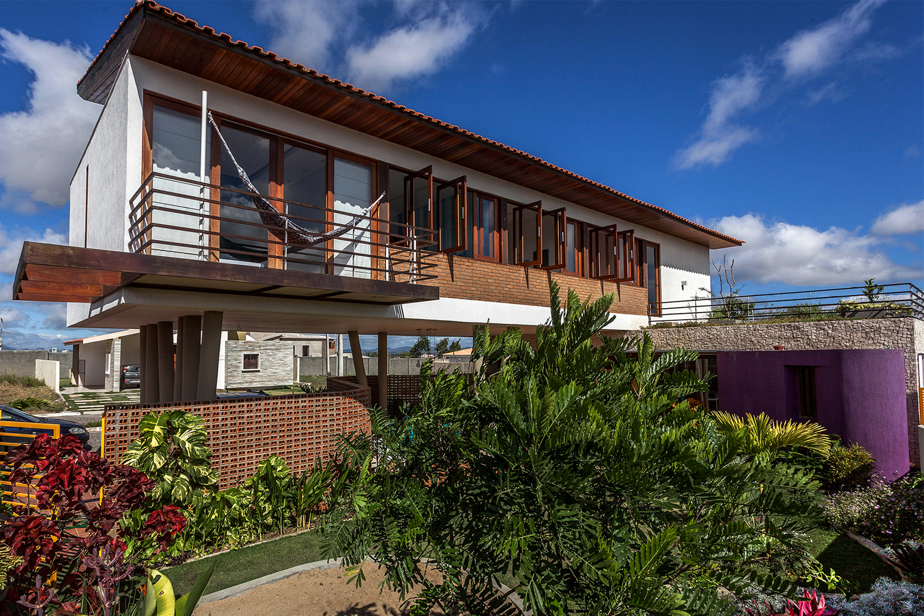 Na área social, uma parede dupla e ventilada protege o poente e confere ao ambiente da sala, que tem pé direito duplo, o conforto térmico necessário. Ainda nesse espaço, o flanco voltado para o norte, recebeu um brise de madeira que impede qualquer incômodo com a entrada excessiva da luz solar, principalmente nos meses de verão, quando o sol se inclina nessa direção. Esses brises permitem que a sala se abra para a vista ou controlam a entrada da luz quando é conveniente.