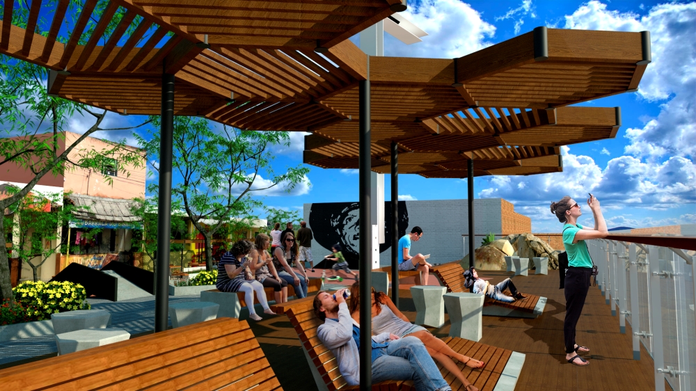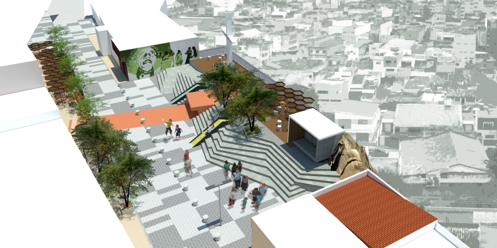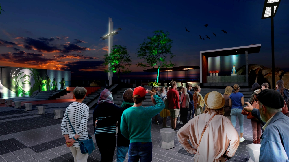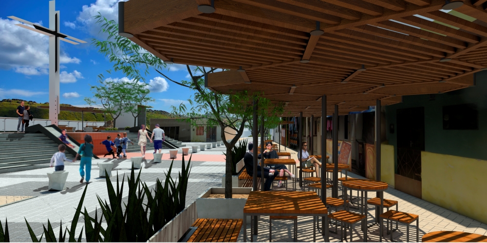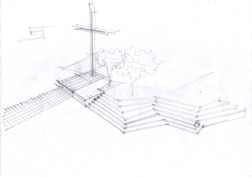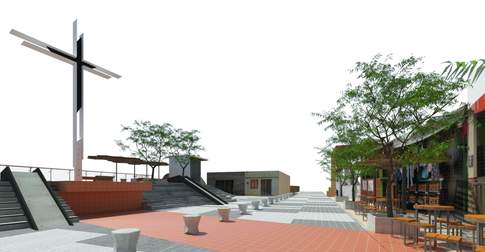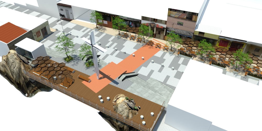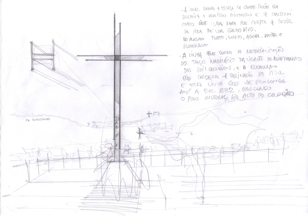 A cruz ganha a escala da cidade. Porém ela respeita o registro histórico e se constrói como que uma rama que cresce a partir da poda de um galho vivo, no mesmo ponto, sendo, agora, maior e iluminada.A linha que surge da materialização do traço imaginário da ligação do alinhamento dos dois cruzeiros, e o elemento que ordena a paginação do piso. É essa linha que se prolonga até a BR 232, marcando o polo cultural do Alto do Cruzeiro.