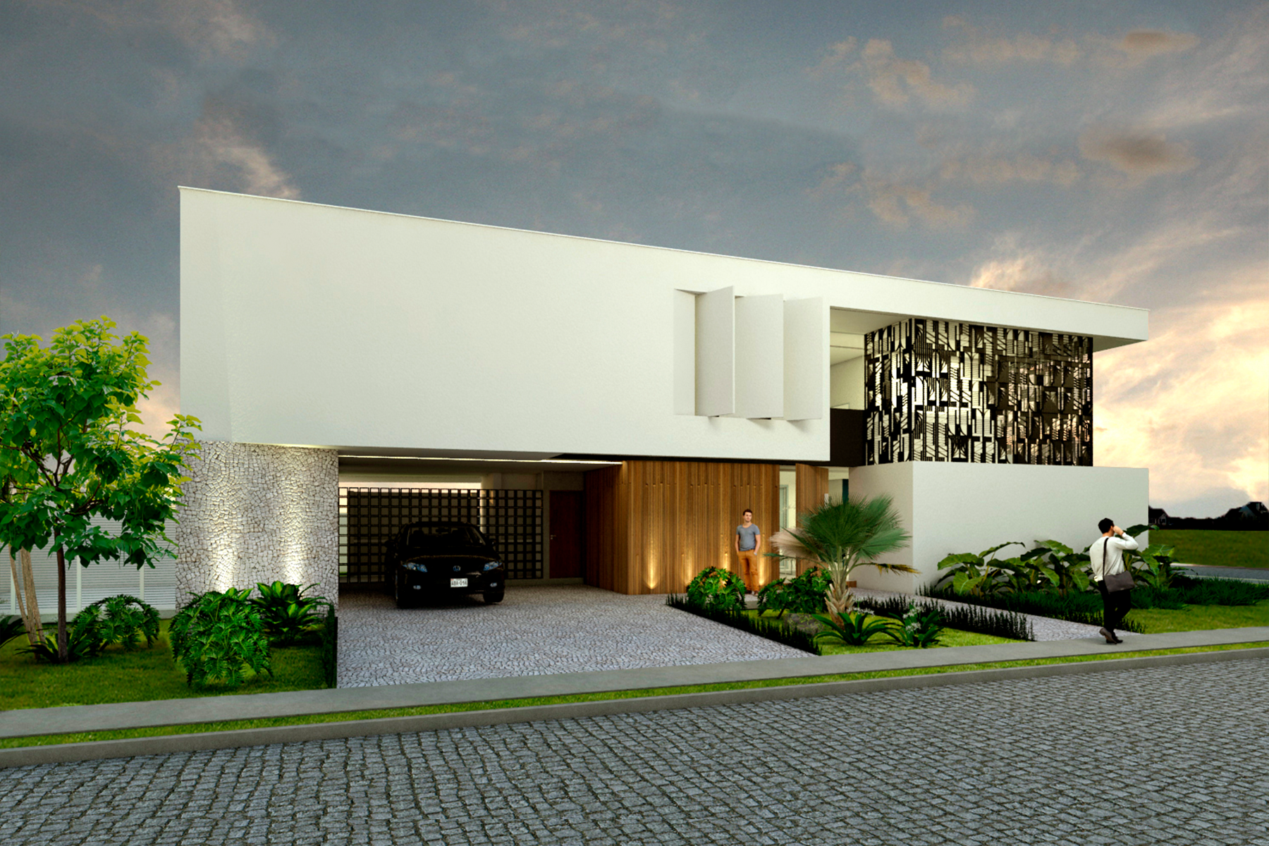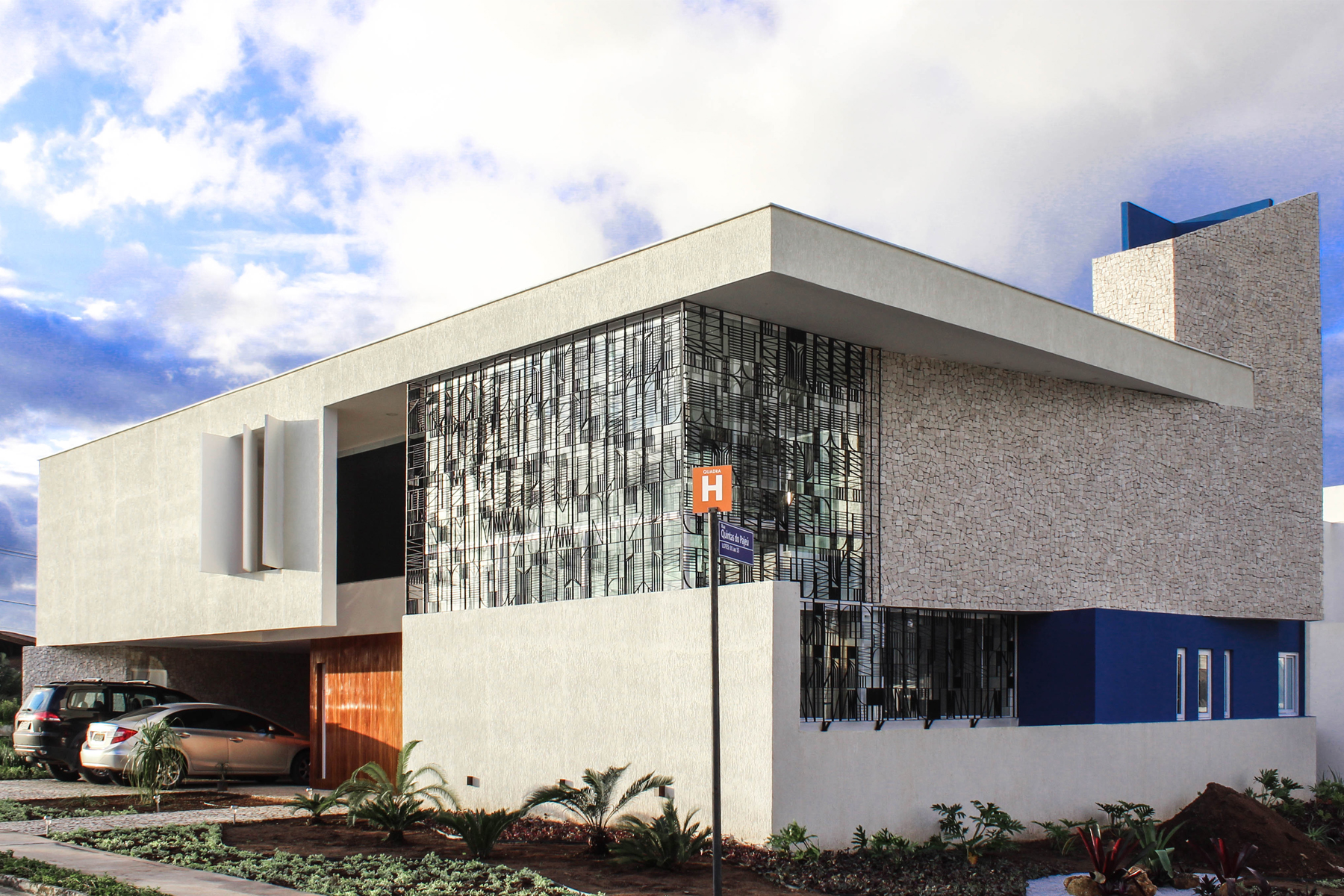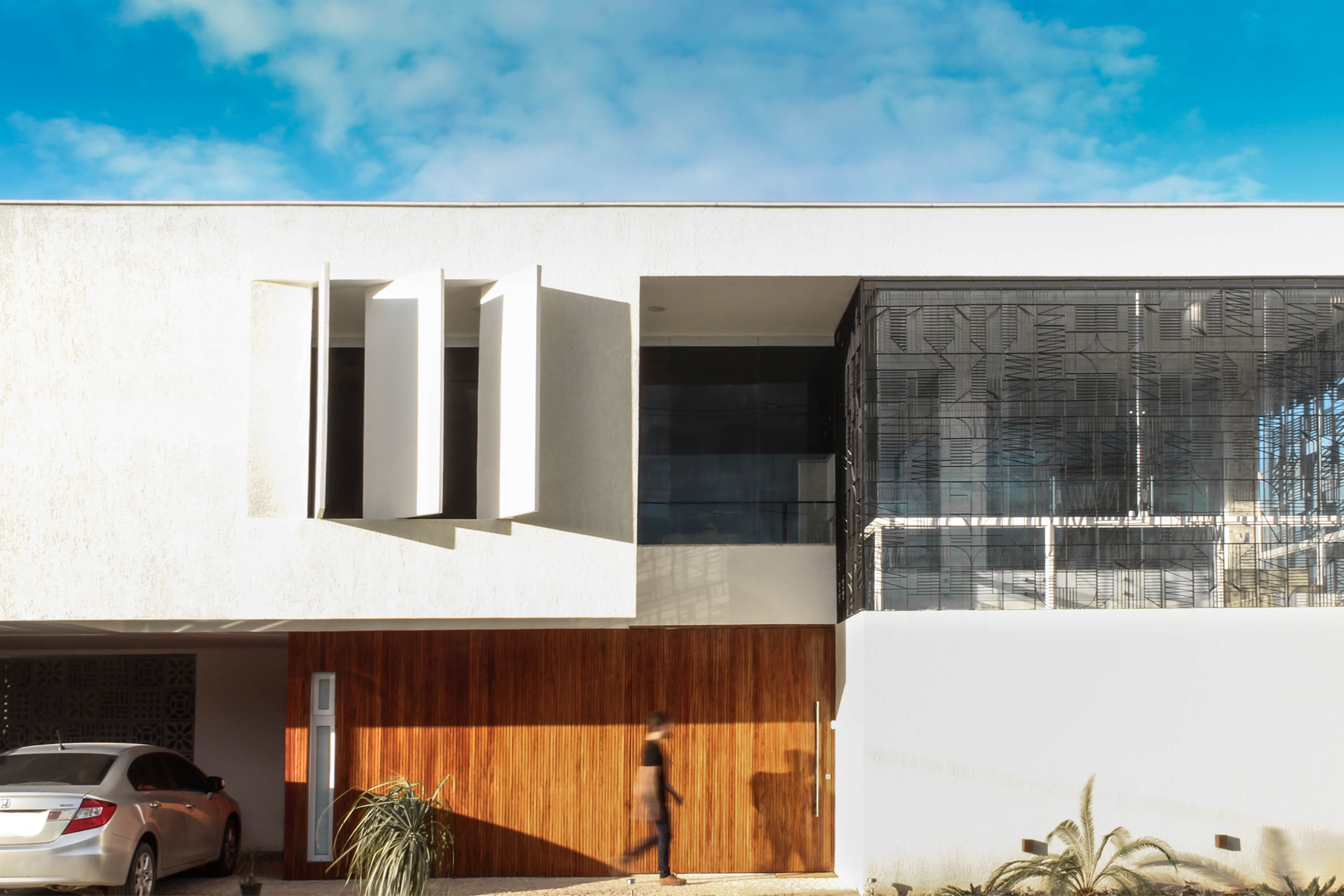 Ao nosso favor, um belo lote, muito bem localizado numa esquina com faces voltadas para oeste e sul. A implantação do programa se dá em favor da intimidade dos ambientes internos. Dessa maneira, conseguimos salas e quartos voltadas para o vazio, estrategicamente posicionado na face nascente. No percurso da casa a fluidez espacial do projeto vai sendo descortinada a cada ambiente. Desde a chegada, na marquise do acesso social, espaços bem iluminados e integrados visualmente entre si, vão se amarrando um ao outro como capítulos de uma história que se interligam revelando, a cada página, o enredo. Assim, o visitante vai sendo conduzido, passo a passo, de maneira a perceber o ambiente social, que se mistura com a escada e percorre pela passarela, findando com a sua passagem na frente da biblioteca, no caminho até os quartos.
