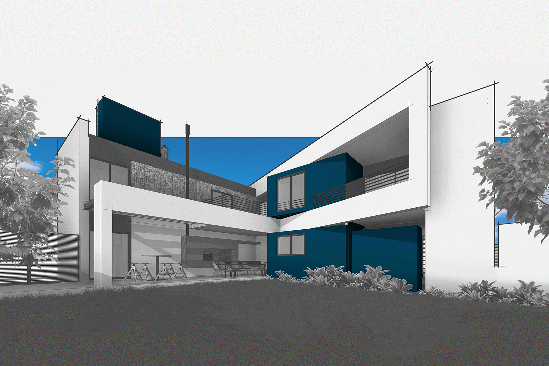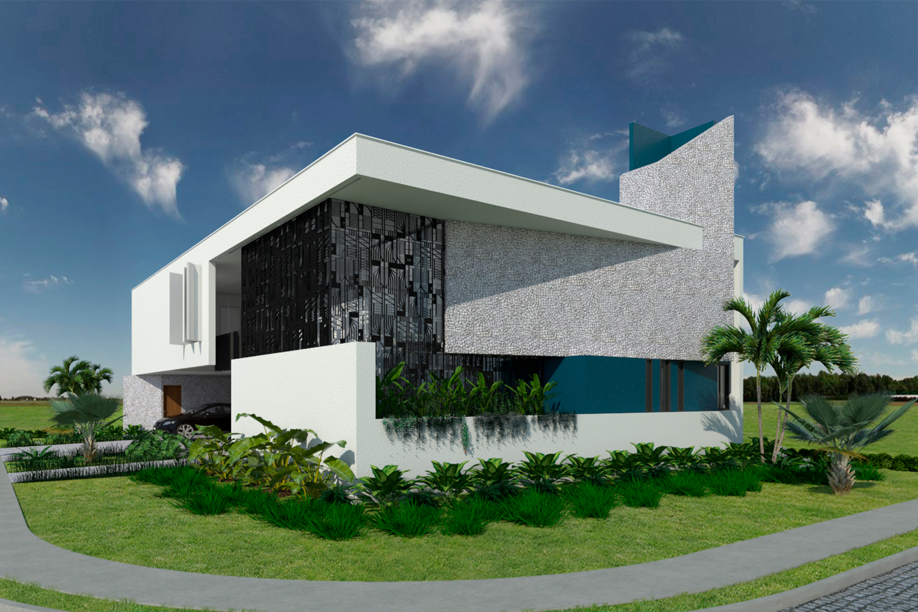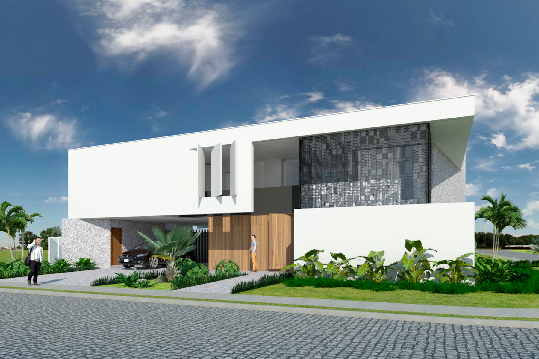 Ao nosso favor, um belo lote, muito bem localizado numa esquina com faces voltadas para oeste e sul. A implantação do programa se dá em favor da intimidade dos ambientes internos. Dessa maneira, conseguimos salas e quartos voltadas para o vazio, estrategicamente posicionado na face nascente. No percurso da casa a fluidez espacial do projeto vai sendo descortinada a cada ambiente. Desde a chegada, na marquise do acesso social, espaços bem iluminados e integrados visualmente entre si, vão se amarrando um ao outro como capítulos de uma história que se interligam revelando, a cada página, o enredo. Assim, o visitante vai sendo conduzido, passo a passo, de maneira a perceber o ambiente social, que se mistura com a escada e percorre pela passarela, findando com a sua passagem na frente da biblioteca, no caminho até os quartos.