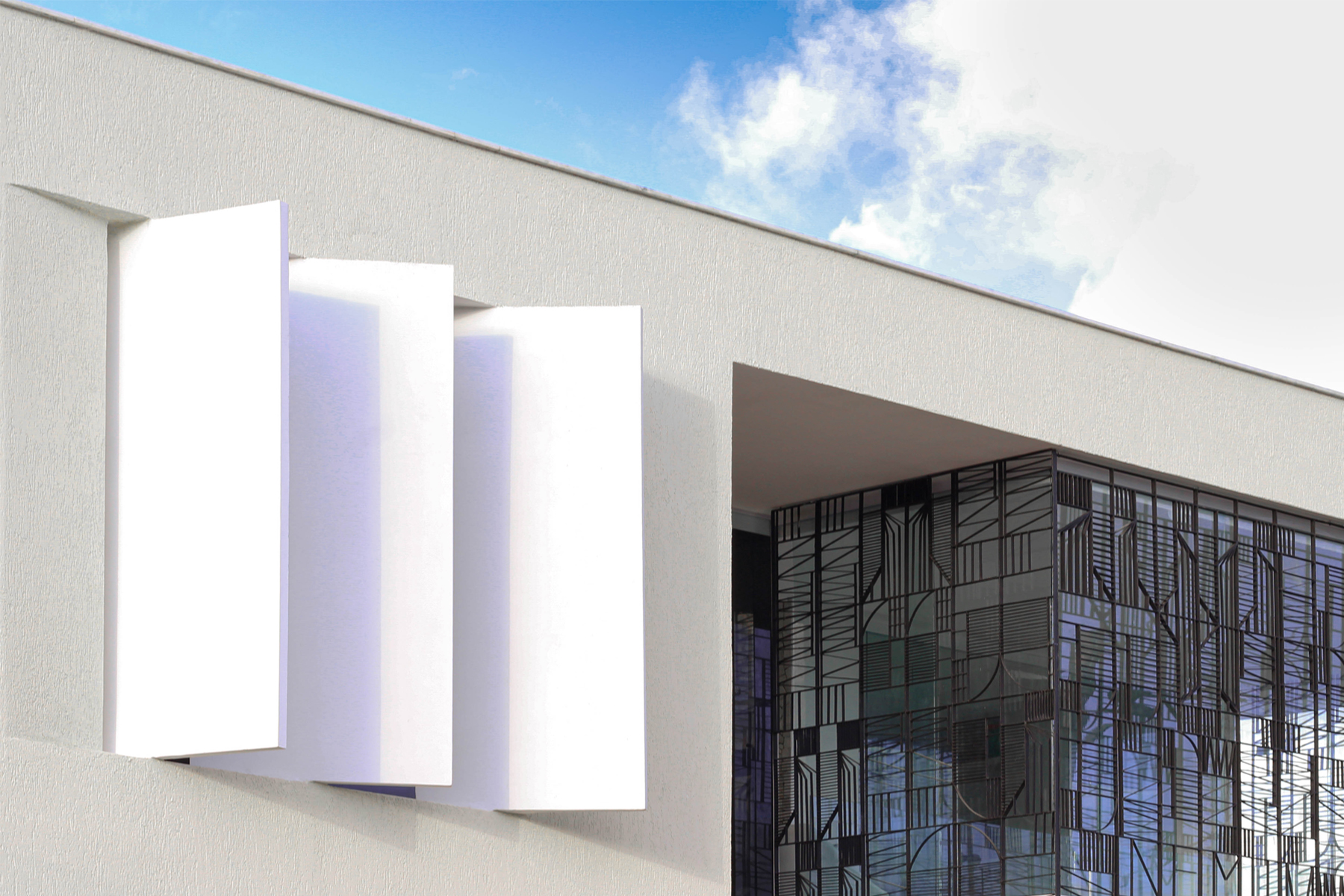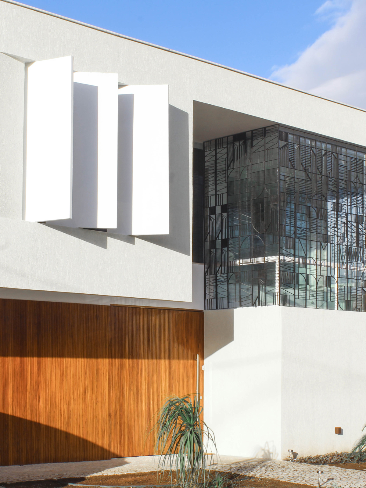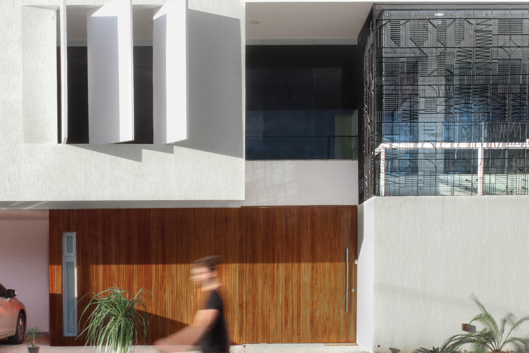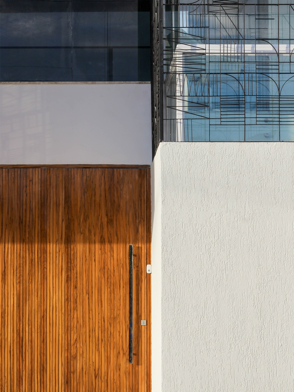 Na esquina, embora nascentes e protegidas pela pestana formada pela laje da coberta, as faces envidraçadas estão vestidas por uma grade de ferro formada por trechos do manifesto comunista de Karl Marx e Friedrich Engels. Com isso, ficam mantidos o mistério e a intimidade da casa, mesmo na fachada transparente, por onde entra a luz, filtrada.