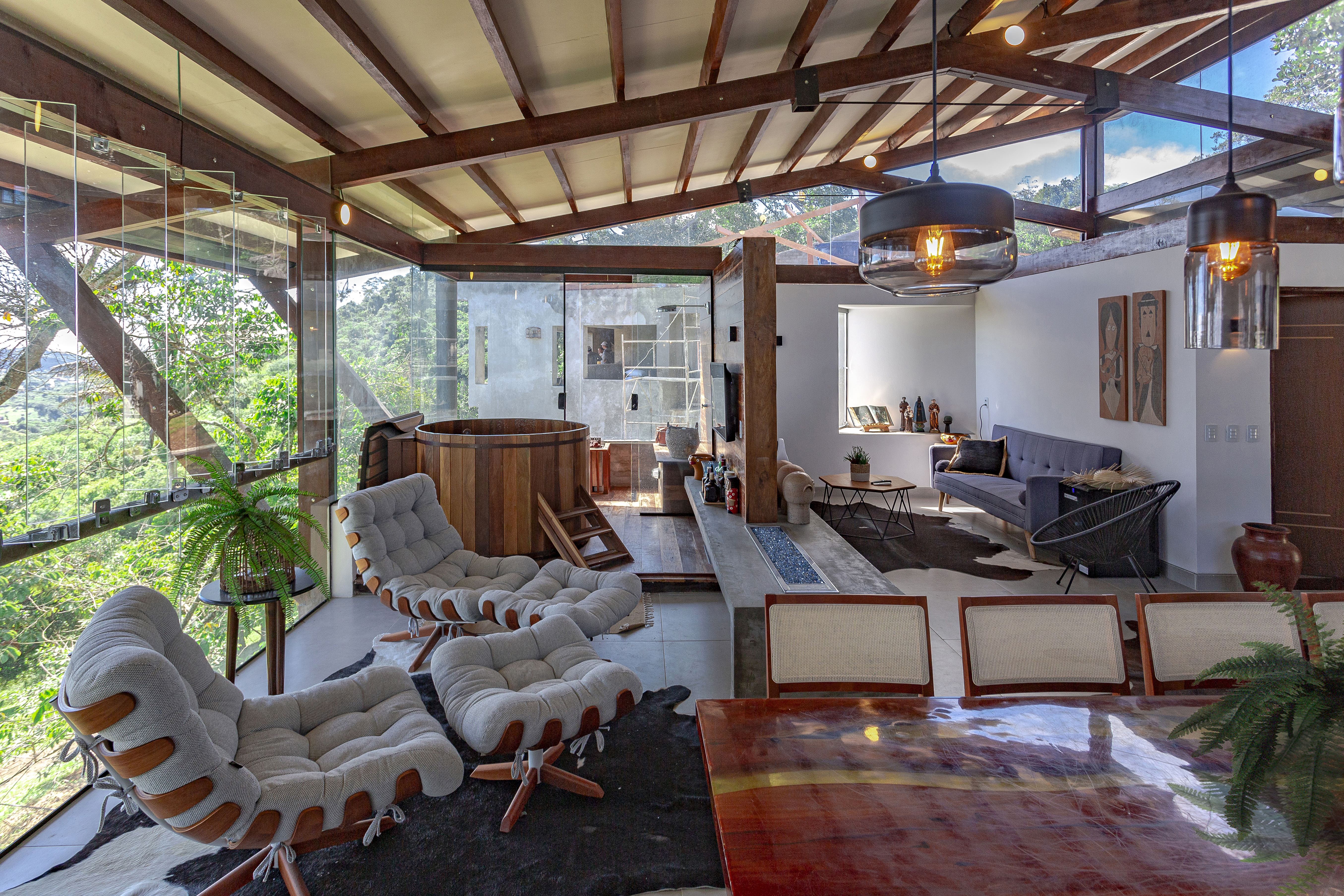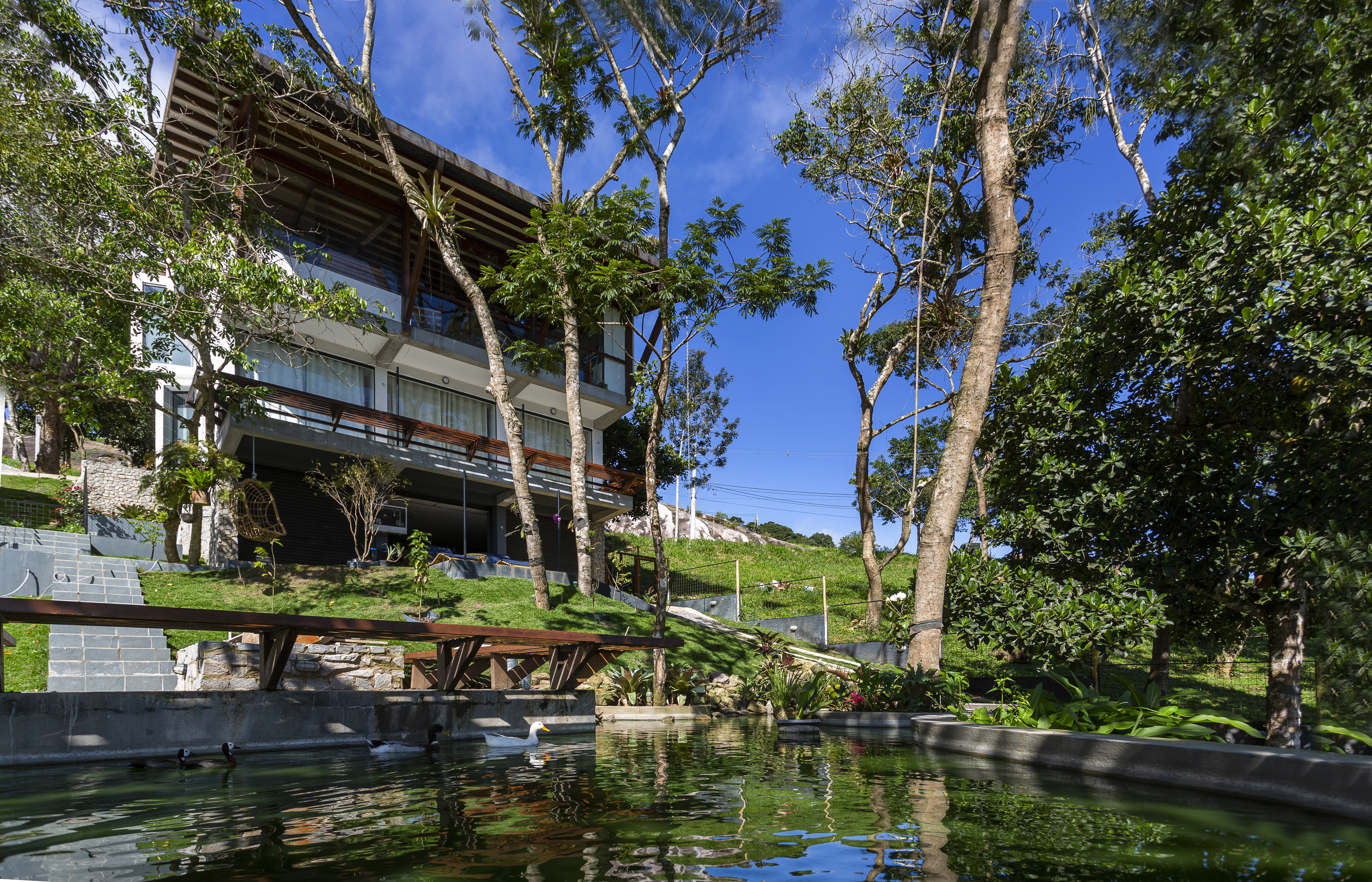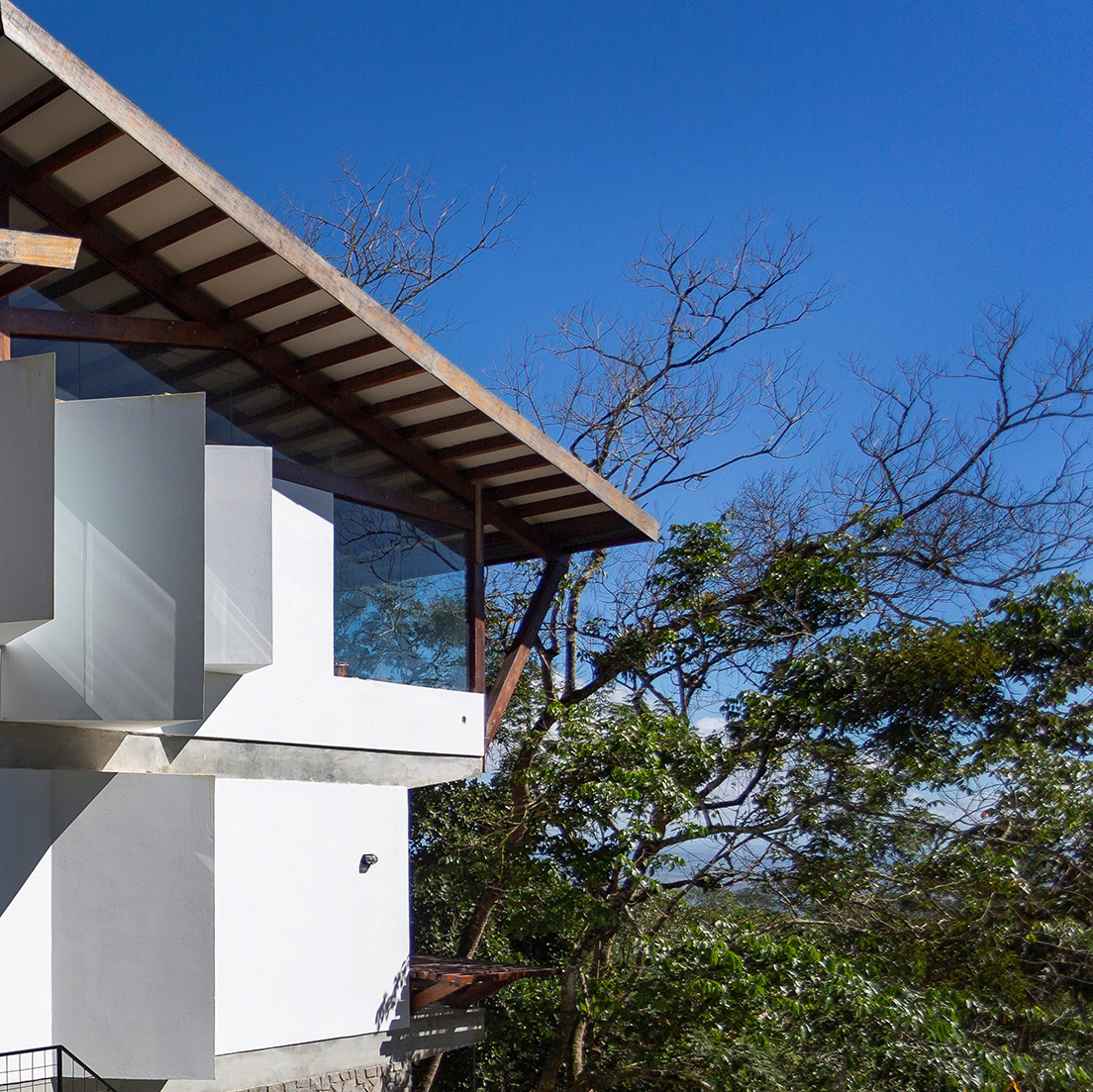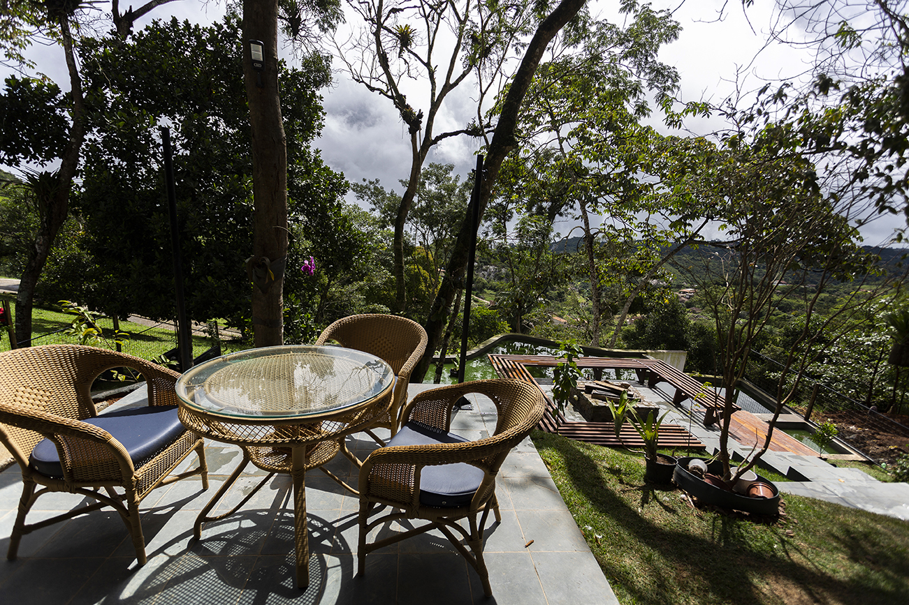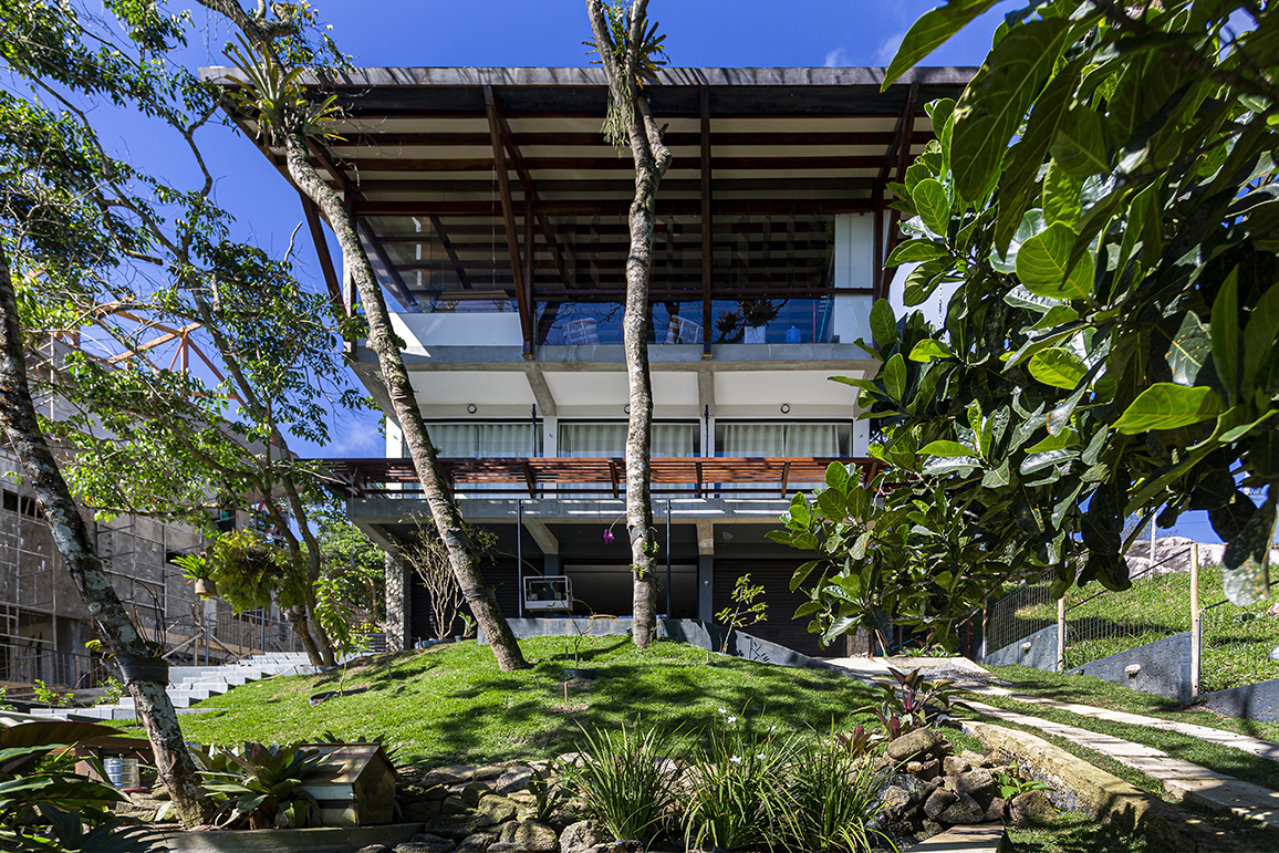 A coberta tem estrutura de madeira com fechamento em placas de fibrocimento e revestimento em ardósia. Nas laterais, buscamos fechar as alvenarias, preservando a intimidade do interior da casa da vista dos vizinhos. Nessas laterais, fizemos bay-windows para procurar, em cada ambiente, a melhor visada da paisagem. Já a fachada norte, que mira a copa das árvores e o horizonte ao fundo, quisemos o mais transparente possível, tendo, assim, a melhor e mais franca integração com o exterior, tanto no nível social, quanto no nível inferior, onde temos as varandas das três suítes cerradas apenas por um banco de madeira, que limita a circulação nesse ambiente.