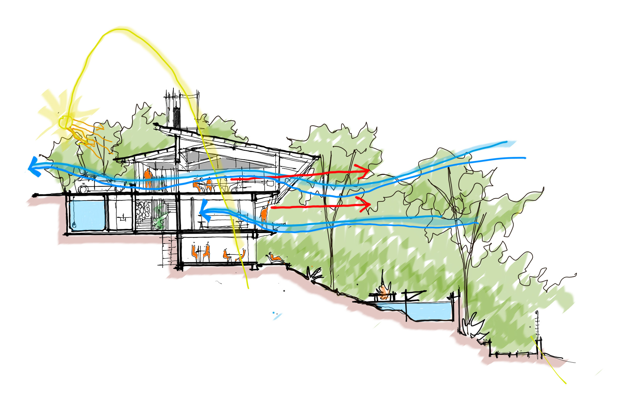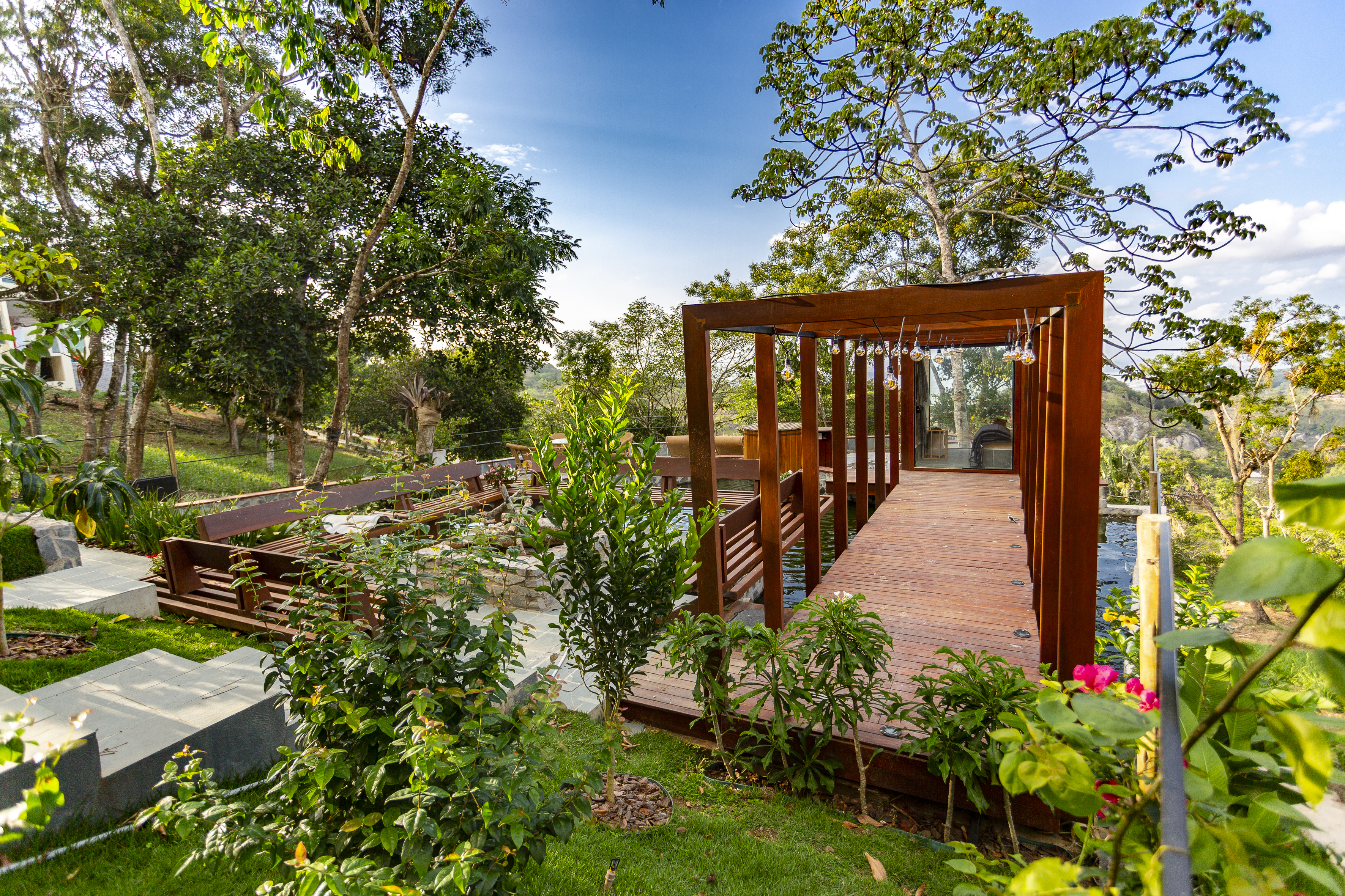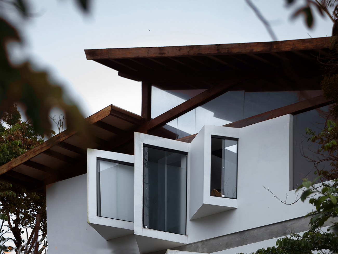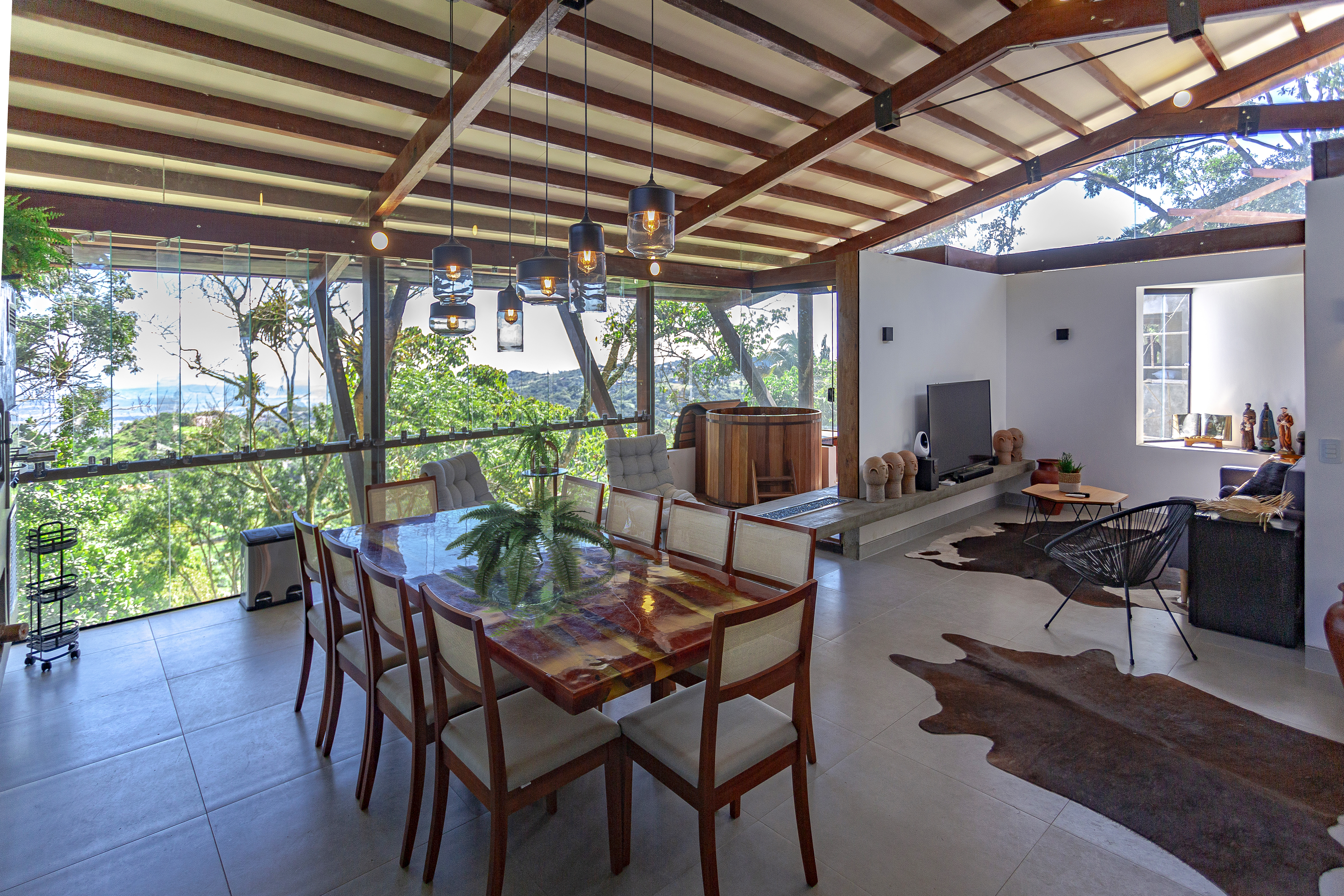 A coberta tem estrutura de madeira com fechamento em placas de fibrocimento e revestimento em ardósia. Nas laterais, buscamos fechar as alvenarias, preservando a intimidade do interior da casa da vista dos vizinhos. Nessas laterais, fizemos bay-windows para procurar, em cada ambiente, a melhor visada da paisagem. Já a fachada norte, que mira a copa das árvores e o horizonte ao fundo, quisemos o mais transparente possível, tendo, assim, a melhor e mais franca integração com o exterior, tanto no nível social, quanto no nível inferior, onde temos as varandas das três suítes cerradas apenas por um banco de madeira, que limita a circulação nesse ambiente.