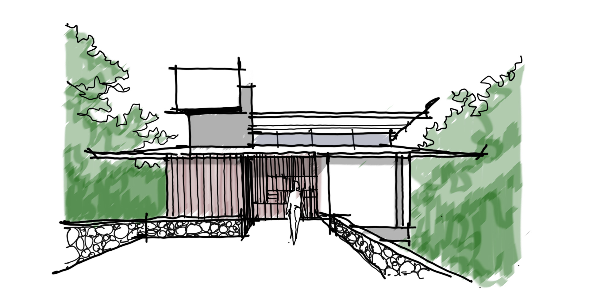 Junto à linha da rua, criamos uma plataforma para ser o abrigo dos veículos e, sob ela, um reservatório inferior, a lavanderia, um depósito e o quarto de serviço.